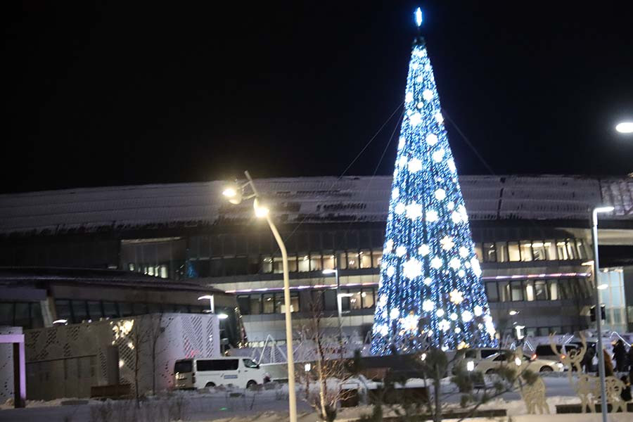 Церемония зажжения ёлки на ЭКСПО состоялась 22 декабря; Её высота составила 25 метров, искусственную красавицу нарядили в разноцветные украшения из 1200 шаров, 250 малых и 20 композиционных снежинок.