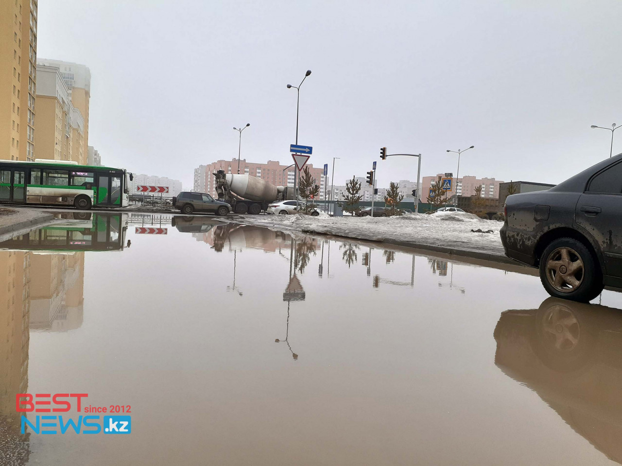 Сегодня корреспондент Bestnews.kz увидел картину на участке дороги в районе пр-та Кошкарбаева, 45. Первое, что здесь бросается на глаза на дороге - большая мутная лужа.