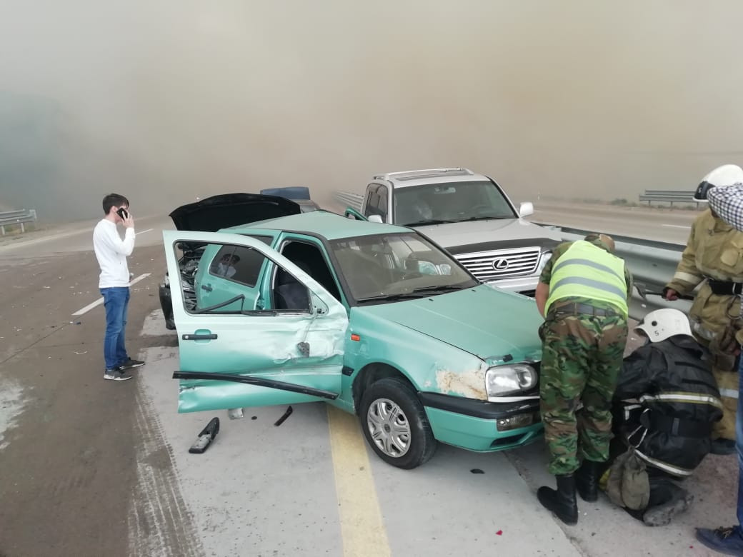 Из-за густого чёрного дыма резко ухудшилась видимость между 33-35 км платного участка «Алматы-Капшагай», произошло ДТП с участием 8-ми автотранспортных средств (3 пострадавших, 1 в тяжелом состоянии). Ориентировочно в 16.30-16.40 на место прибыли сотрудники противопожарной службы, дорожной полиции и «Скорой медицинской помощи».