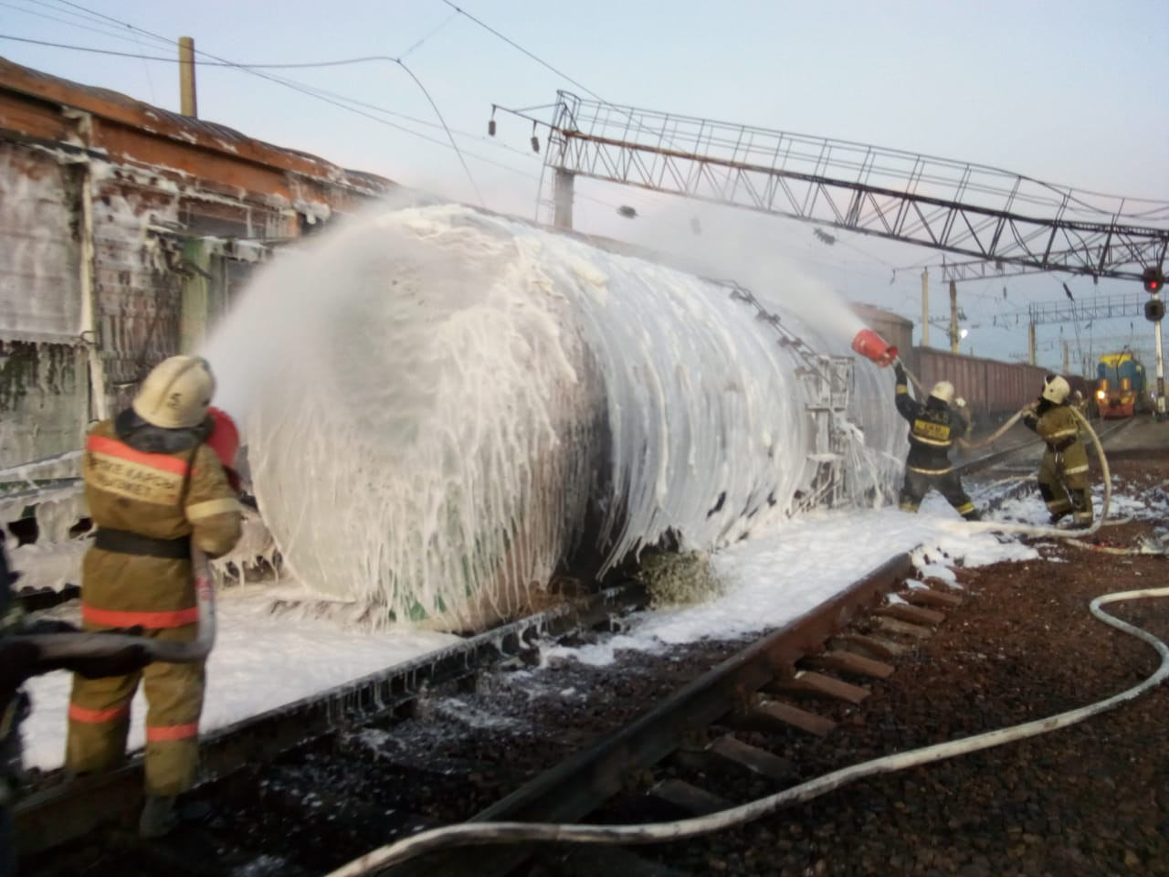 В Шуском районе, на ж/д станции Шокпар сошли 1 цистерна с бензином 60 тонн и 1 платформа с контейнером, грузового поезда № 2950 сообщением «Алматы-Актогай». При этом цистерна с ГСМ опрокинулась на бок, произошёл разлив нефтепродуктов с последующим загоранием.
