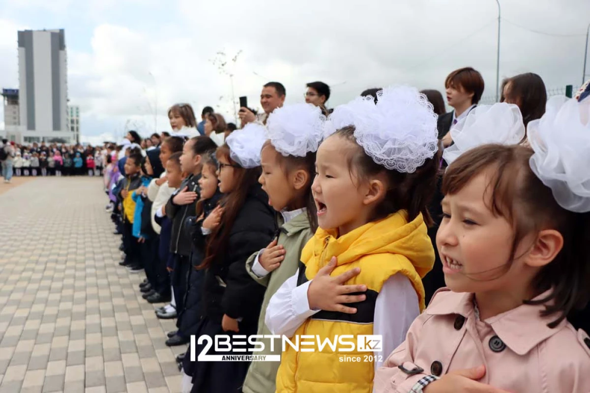 В торжественной линейке принял участие министр просвещения Республики Казахстан Гани Бейсембаев. Линейка была короткой - потому что на улице было пасмурно, и начал накрапывать дождь.