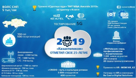 Стоит отметить, 2019 год стал значимым для компании, «Казахтелеком» отметил свое 25-летие. За четверть века были достигнуты результаты по всем направлениям деятельности, в первую очередь, благодаря профессионализму сотрудников. Так, в прошлом году компания продолжила работу по внедрению корпоративных ценностей и в филиалах «Казахтелеком» подвели итоги «CREDO – путь к культуре успеха». По численности проект объединил четвертую часть компании, а это порядка 5 000 сотрудников, которые разработали 400 проектов. Все они направлены на увеличение операционной эффективности компании, улучшение продаж, развитие в сферах инноваций и информационных технологий. Также добавим, что проект «Казахтелеком» по внедрению корпоративных ценностей CREDO признан лучшим по итогам онлайн-голосования на международной конференции Intercom в Москве.