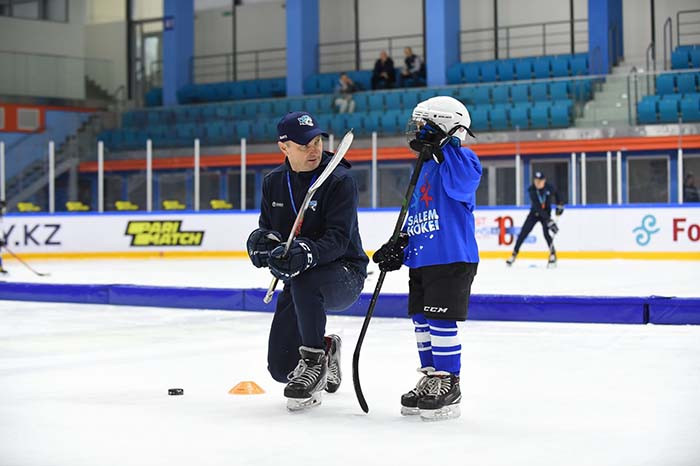Затем легендарные хоккеисты Талгат Жайлауов и Константин Пушкарев провели мастер-класс для 6-7-летних хоккеистов.