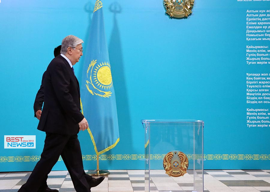 После этого Касым-Жомарт Токаев сразу направился в кабинку, где заполнил бюллетень.